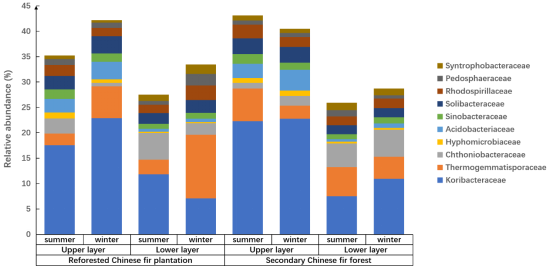 Figure 1 The relative abundance and composition of prokaryotes in soil of Chinese fir forests in subtropical Nanling National Nature Reserve at family level