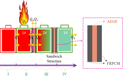 本研究从温度、电压、质量、质量变化速率、热通量和传热等方面揭示了夹芯结构对锂离子电池热失控传播的抑制效果。增加FRPCM的厚度可以增加相邻电池的传热并延长热失控传播时间。热通量随着材料厚度的增加而降低。FRPCM厚度的增加导致电池模组的质量损失总体增加,而AEGF厚度的增加不会对质量损失产生显著影响。最后,使得电池组热失控传播阻断的夹芯结构最小厚度仅需5 mm。