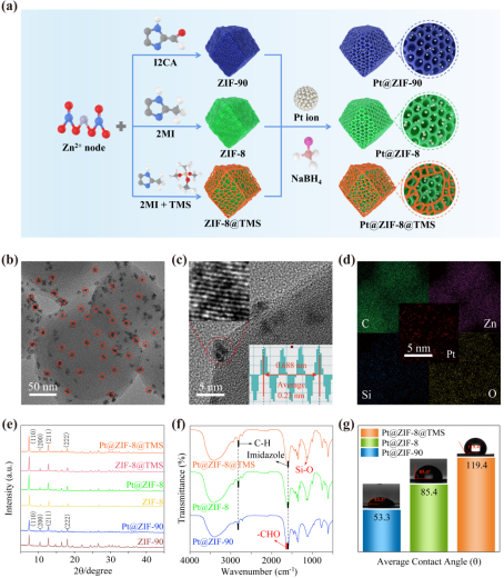 该文将 Pt 纳米颗粒浸渍在具有不同亲疏水性官能团的 MOF 中 (Pt@ZIF-90, Pt@ZIF-8, Pt@ZIF-8@TMS),揭示了水分子在类过氧化物酶催化反应中的关键作用。最终,Pt@ZIF-8@TMS 的强疏水作用使其类过氧化物酶比活性高达 1485.80 U/mg,且催化效率 (kcat/KM) 高达 2.72 × 108 M-1 s-1,分别是亲水性 Pt@ZIF-90 和天然酶的的 21 倍和 288 倍。