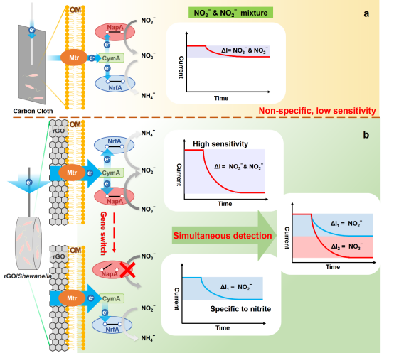 生物电化学传感器(BES)是一种基于电活性微生物胞外电子传递特性,将环境污染物浓度转化为电信号的传感装置。以具有双向跨膜电子传递途径的希瓦氏菌为例,其可利用外源电子还原水体中的硝酸根或亚硝酸根,根据底物浓度的高低产生不同的反向电流信号,进而反映水体中污染物浓度,具有低成本、检测灵敏、实时监测等优势。然而,由于电活性菌固有的硝酸盐还原途径,难以区分识别实际水体中共存的硝酸根和亚硝酸根,极大限制了生物电化学传感器的实际应用。