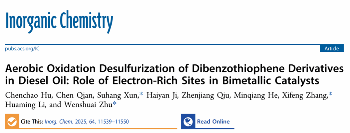 最新研究论文“Aerobic Oxidation Desulfurization of Dibenzothiophene Derivatives in Diesel Oil: Role of Electron-Rich Sites in Bimetallic Catalysts”在《Inorganic Chemistry》(Nature Index,SCI一区)期刊发表。av麻豆