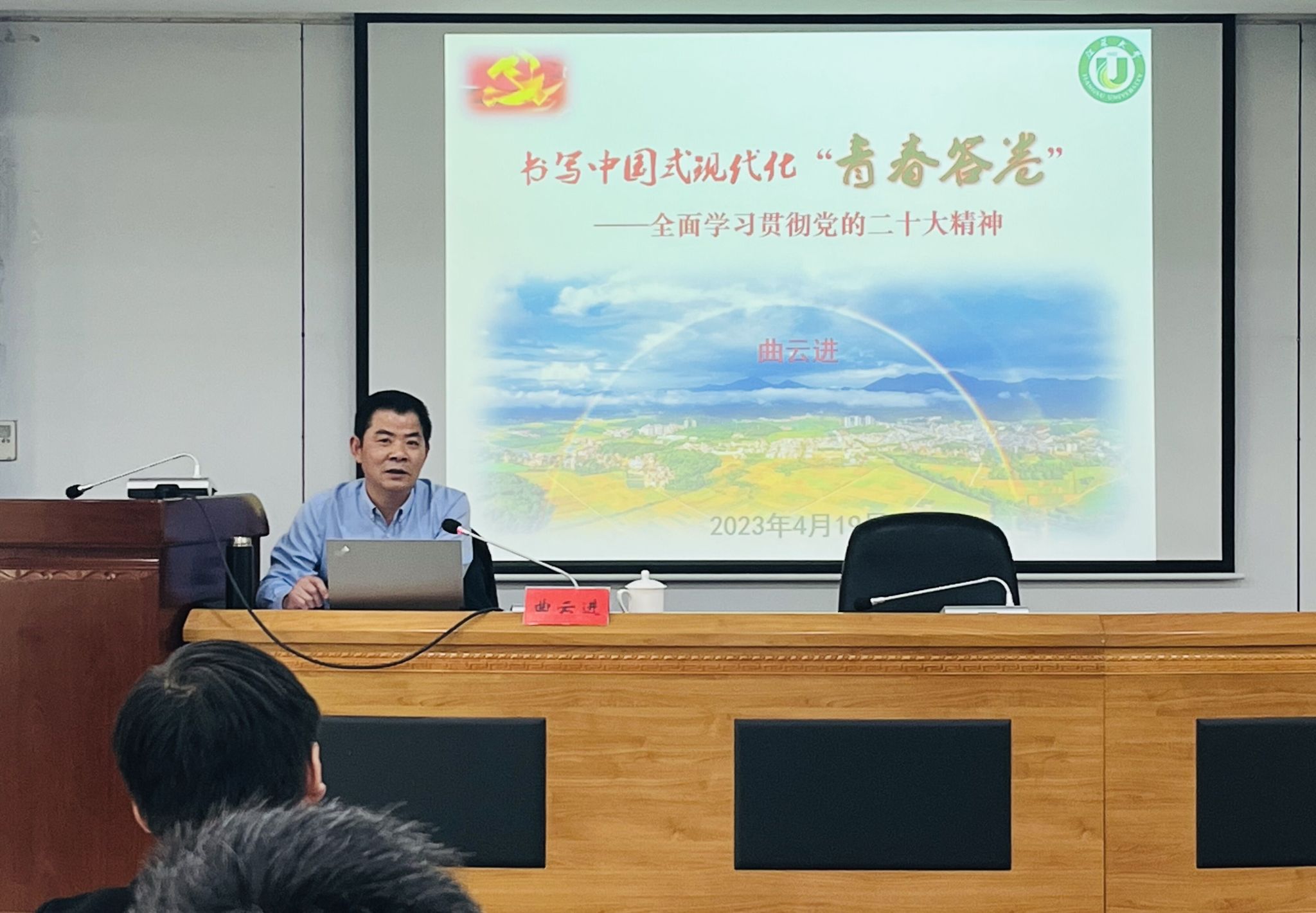 曲云进的讲座《书写中国式现代化“青春答卷”——全面学习贯彻党的二十大精神》内容丰富、思想深刻、指导性强。重点就党的二十大报告中关于中国式现代化、教育科技人才、马克思主义基本原理同中华优秀传统文化相结合、文化自信自强、党的建设、乡村振兴等重大命题与重要部署进行具体解读,并结合av麻豆